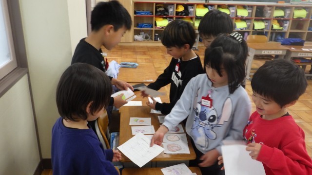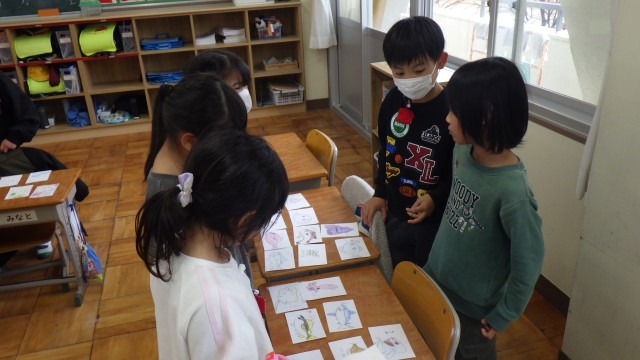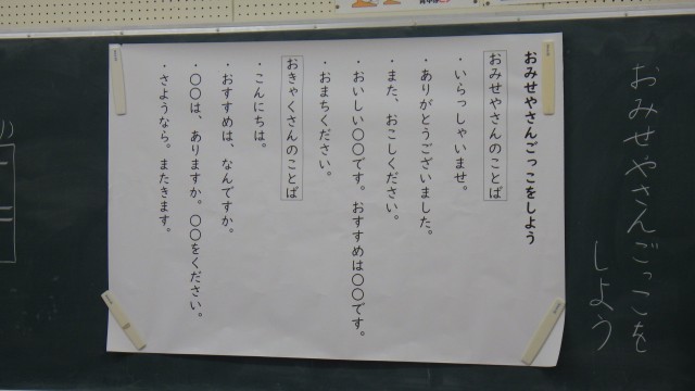 国語「もののなまえ」の学習の一環で、「おみせやさんごっこ」をしました。「さかなやさん」「すしやさん」「おかしやさん」「カフェ」の4つのお店ができました。前半と後半に分かれ、おみせやさん役とおきゃくさん役の両方をやりました。「いらっしゃいませ」と元気な声が聞こえてきました。