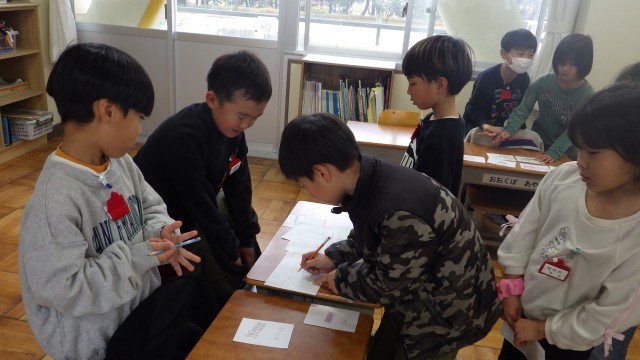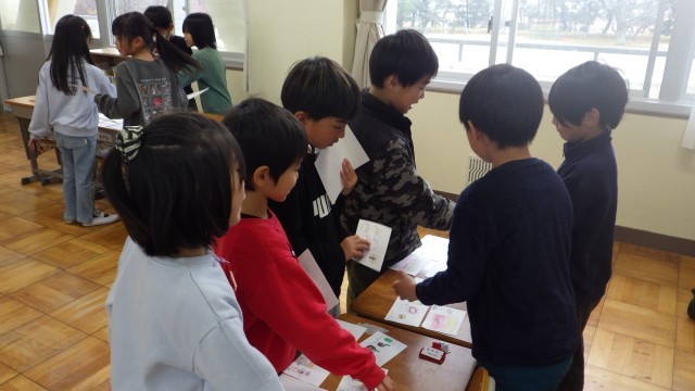1年生、4年生は図工で作品を作っていました。2年生は友だちに手紙を書く勉強をしていました。