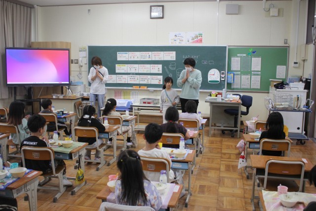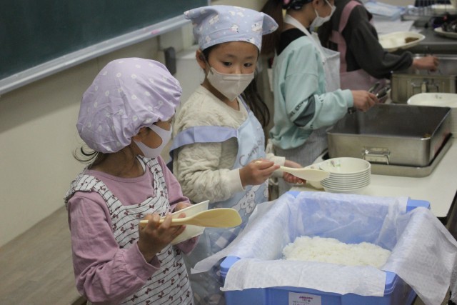 2年生から6年生までは給食が始まりました。初日のメニューは、みんなの大好きなハヤシライス、とりのたつたあげ、ツナサラダ。今日から、それぞれが持ってきたエプロンで当番をするので、教室も少し華やかになりました。今日もおいしくいただきました。