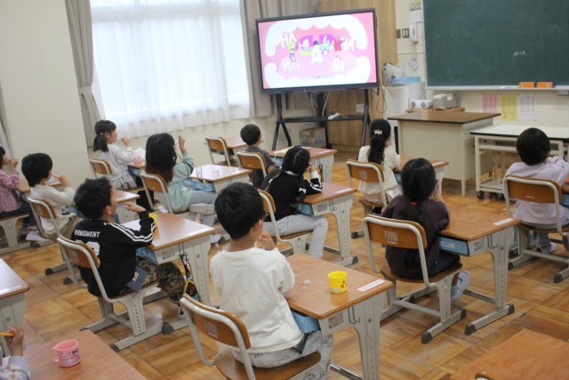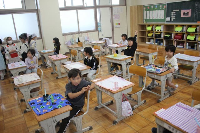 昨日の雨のせいで、今日はグラウンドが使えません。大放課は教室で静かに過ごします。1年生の教室には、いろいろな学年の子が訪ねてきてくれました。粘土をしたり、トランプをしたり、タブレットを使ったりしながら、思い思いに過ごしていました。