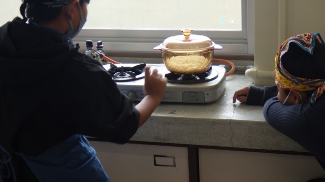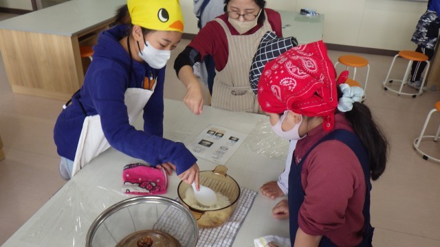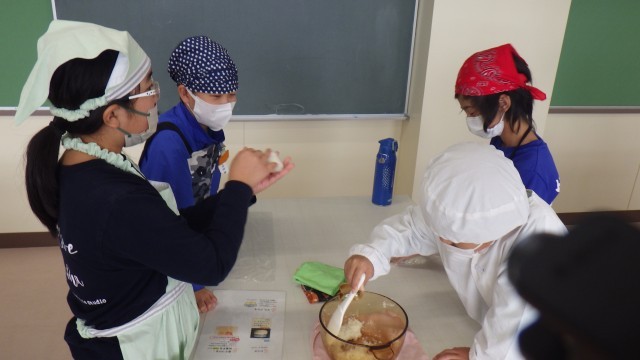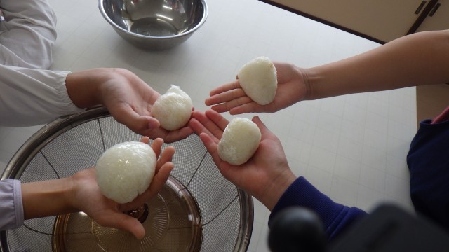 10/21 5年調理実習 公開日 2025/10/22 更新日 2025/10/22 校長室 5年生の家庭科では、炊飯の学習をします。中の様子が見えるようにガラス鍋を使います。沸騰したり米が動いたりするのをじっくり観察して火加減を調整します。炊き上がったごはんは、ラップでおにぎりにして味わいました。 +2