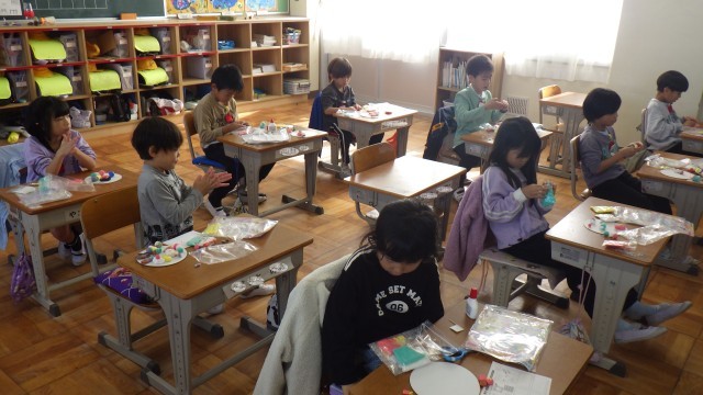 1年生の図工では、カラフルな紙粘土ですきなたべものを作りました。
