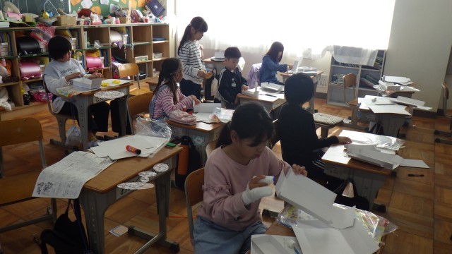 2年生は、箱を組み立てて組み合わせ、「ともだちハウス」を作っています。さて、どんなハウスができるかな。