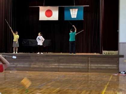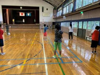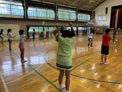 大放課のトーチ練習は、雨のため体育館で行いました。音楽と加藤先生に合わせて練習しました。音楽がかかると雰囲気が出てきますね。