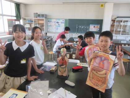 理科 人の体の臓器の学習 公開日 2019/06/13 更新日 2019/06/13 6 年 6月13日(木) 理科の学習で体の中の臓器の学習をしました。人の体の中にあるさまざなま臓器は,関わり合ってはたらいています。グループで協力して人体模型を使って臓器の場所を確認しました。場所を正確に覚えることができたかな。