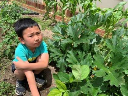 2年生がお世話をしている畑の野菜が、ずいぶんと成長して、葉も青々と元気に茂ってきました。