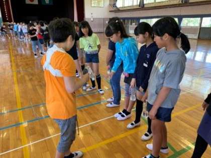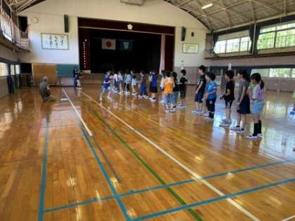 体育館から5年生の元気な歌声が響いてきました。のぞいてみると、キャンプファイヤーのスタンツの練習でしょうか、森川先生のギターに合わせて、みんな元気に歌ってます。