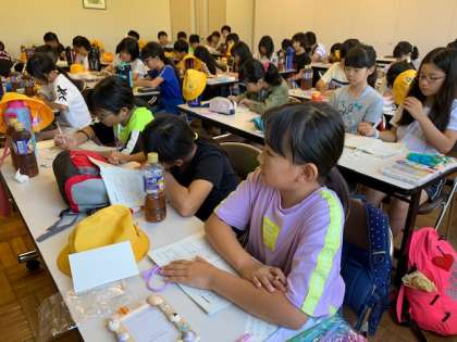 2日目の活動の振り返りと思い出の絵はがきを描いています。楽しかった野外教育活動も終わりを迎えようとしています。