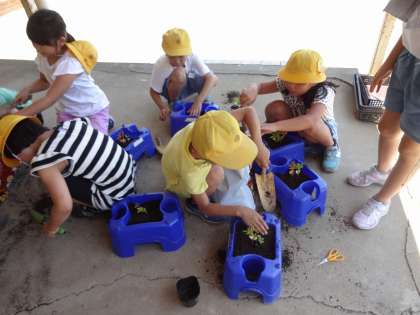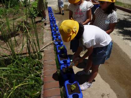 6月25日(火)5月に種をまいて育てているホウセンカがポットの中でずいぶん生長しました。今日の理科の時間は班で力を合わせて大きな鉢に植えかえをしました。どの班も協力してスムーズにできました。今日の植えかえ活動は大変よくできました。ピースマーク一個ゲットです。きれいな花が咲くようにがんばって育てましょう。