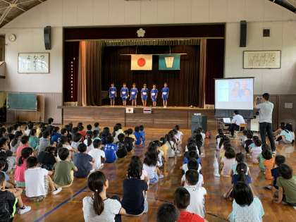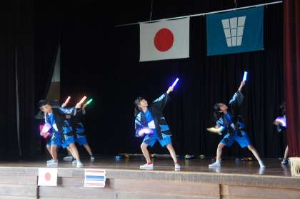 朝会の時間に、TSIE海外派遣団の壮行会を開催しました。カルチャーショーで発表する演奏と踊りを全校児童の前で披露しました。