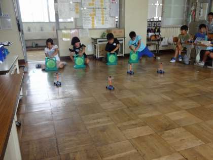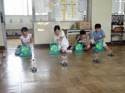 理科の学習「風とゴムのはたらき」のまとめとして,班対抗カーレースを行いました。カーレースはとても盛り上がり,楽しく学習のまとめをすることができました。