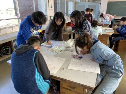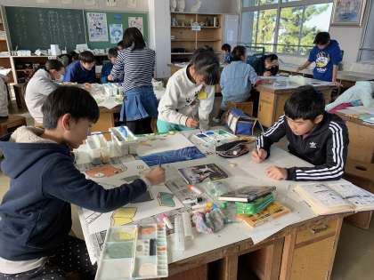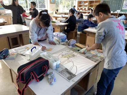 読書館挿画の彩色に取り組んでいます。どんな色にしようか、真剣に考えながら彩色しています。