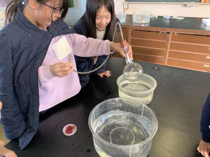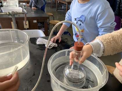 空気の温度と体積 公開日 2019/11/29 更新日 2019/11/29 4 年 11月29日(金) 5・6時間目に、閉じ込めた空気を温めたり、冷やしたりすると体積は変わるかを実験しました。 栓をしたフラスコを湯や冷水につけたとき、閉じ込められた空気によって、フラスコの先のビニル管に詰めたゼリーがどう動くかを見ました。 思ったよりも速く大きく動いて、見ていて面白かったですね。