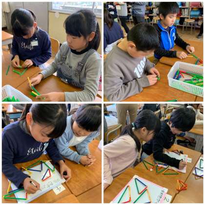 3年細野学級で算数「三角形」の研究授業を行いました。異なる長さのストローを組み合わせ、いろいろな三角形を作ります。その辺の長さに着目して、二等辺三角形や正三角形、その他の三角形に分けました。グループに分かれて三角形作りをして、班の友達と三角形をどのように仲間分けすれば良いのか話し合うことを通じて、グループ分けをすることができました。みんなの前でもどこに着目してグループ分けしたのか、説明することもできました。