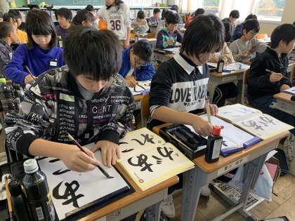 筆の穂先の動き、線と線のつながりに気をつけて練習をしています。「こ」「か」などのでは、特に大切ですね。「あ」「れ」では筆の動きを止めて、折り返す筆使いが必要です。