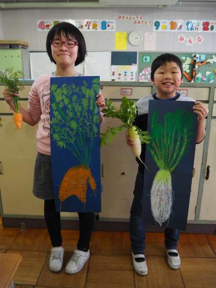大きく育ちました! 公開日 2020/01/24 更新日 2020/01/24 すずらん 畑で育っていた野菜を収穫して野菜の絵を描きました。 「上の方は緑色だね。」 「線がたくさんある!」 「葉っぱは丸いね。」 とつぶやきながら,よく観察して描いていました。 5時間目は,みんなでジャガイモの収穫をしました。 大きなお芋が穫れました!
