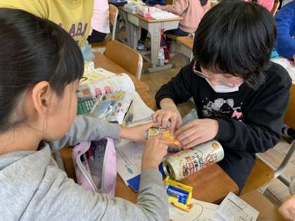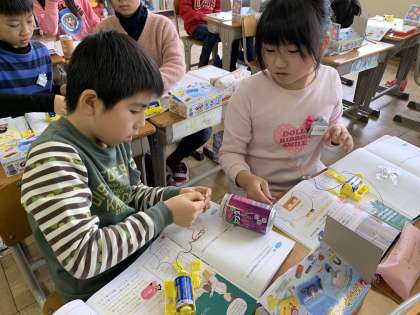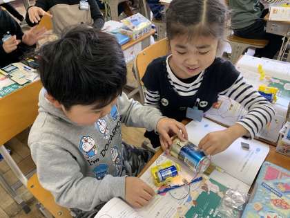 前回の授業で、回路の途中に鉄や銅、アルミニウムなどの金属をつなぐと明かりがつき、紙やプラスチックなどをつないでも明かりがつかないことがわかりました。今日は、回路の途中に空き缶をつないで、豆電球がつくか調べました。空き缶をそのまま回路につないでも豆電球はつきません。紙やすりで、空き缶の絵を削って線をつなげると・・・