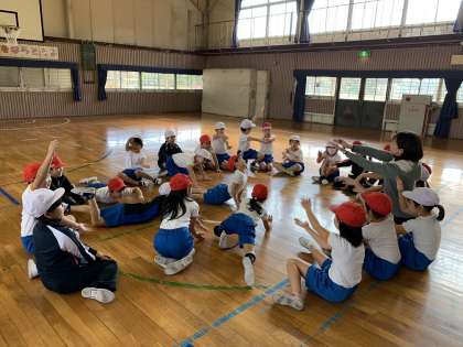 動物になりきって、体全体でその動物の動きを表現しました。ウサギやワニ、鳥やゴリラやアザラシにもなりました。先生と一緒に動物を決めるときも、とっても楽しそうですね。