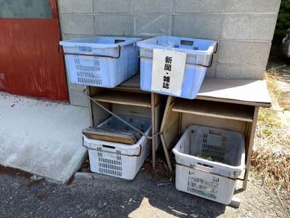 上の2枚の写真は、学校の駐車場にあるコンテナです。入れるものの札がついていますね。布類や段ボール、新聞紙や雑誌などを集めていますね。これらのものは、集めてどうするのでしょうか?