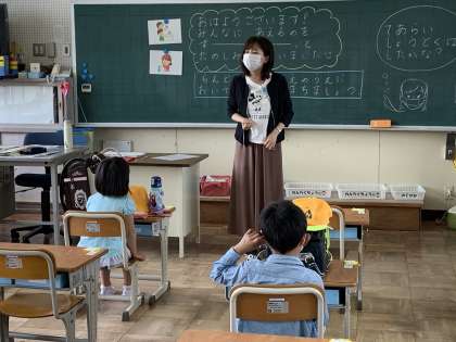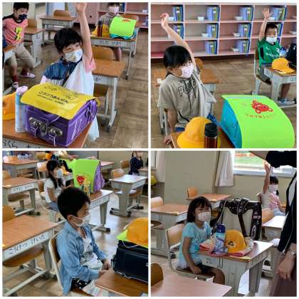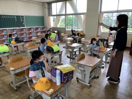 1年生は全てが初めての体験です。担任の齊藤先生と教室に入ってからの朝の準備の仕方の確認をしています。先生のお話を聞いてしっかり覚えてね。