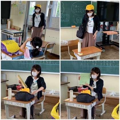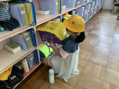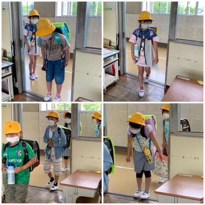 齊藤先生のお手本を見て、教室に入るときのおはようのあいさつから、自分のロッカーにランドセルをしまうまで、実際に練習です。