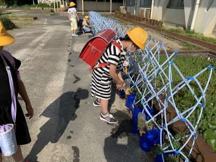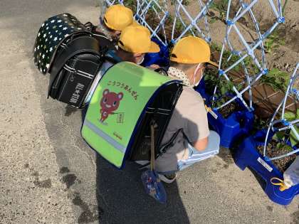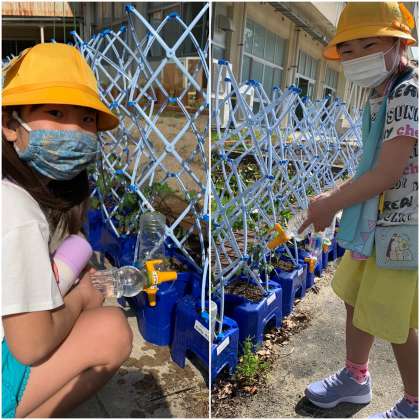 2年生のみなさんが、自分の野菜に水やりをしています。学校に着いたら、まずお水をあげましょう。