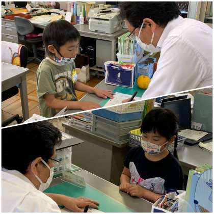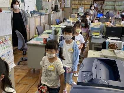 1年生が、職員室と校長室に学校探検で来てくれました。みんな職員室の入り方も大きな声でじょうずにできましたよ。