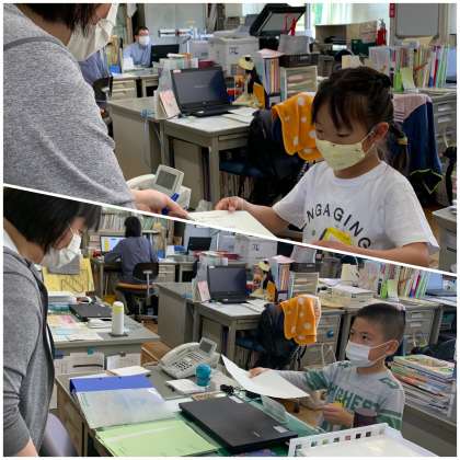 職員室では、校長、教頭からサインをもらうことになっていました。校長先生と教頭先生の名前もしっかり覚えてね!