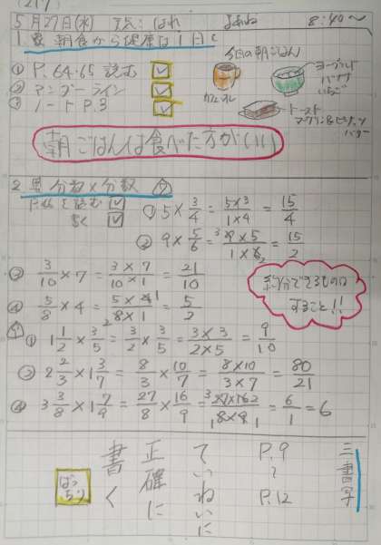 5月27日の自学帳の例です。参考にして学習しましょう。