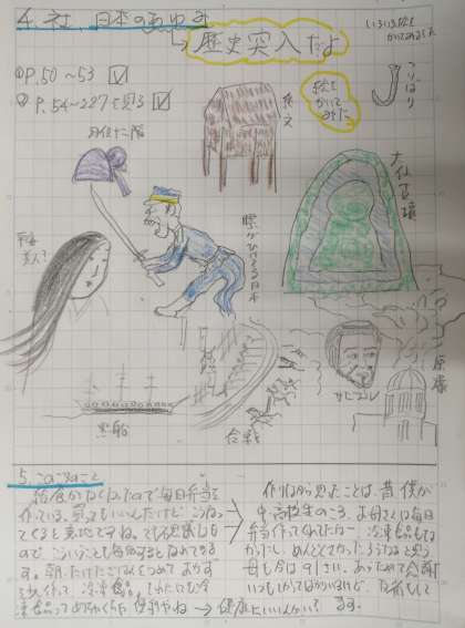 27日の社会科は歴史の写真などを見ることになっていたので、絵を描いてみました。そういうところは自分の工夫で進めてください。自分らしさを出して、楽しんで学習してください。