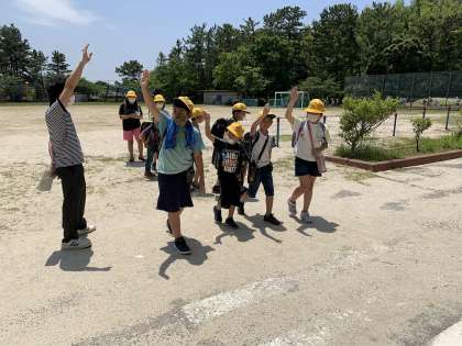 通学団会に続いて歩行訓練を行いました。ここでは、横断歩道の渡り方と一列歩行について確認をしました。班長のかけ声に合わせて手上げと左右の確認をします。ややもするとポーズだけになっていて自分の目できちんと左右の確認をしていない子、手上げも不十分で自分の頭より下に手がある子もいました。大切なことは、「自分の命は自分で守る」という自覚があるかどうかです。班長・副班長さんの役割は重要ですが、一人一人が交通安全の意識を持って登下校しなければなりません。自分の命は自分で守ることを鉄則として、今後も交通安全指導を繰り返し行っていきます。