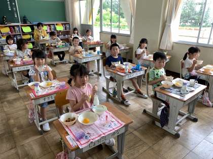初めての給食です。みんなおいしそうに食べています。みんな静かにもぐもぐ給食です。