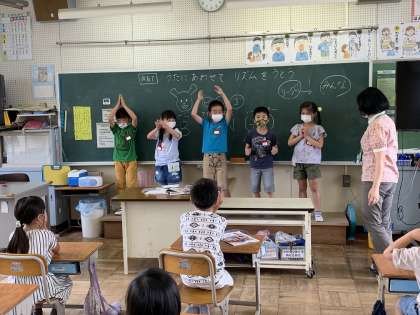 歌の合わせて、楽しそうな手拍子が聞こえてきます。今のところ、音楽の授業で思いっきり歌は歌えませんが、マスクをしながら歌い、手拍子でリズムを打つ練習をしています。リーダー班に合わせて、他のの班が追っかけて手拍子も打っています。みんなとても楽しそうです。2年生の音楽は、専科の服部三三子先生が担当します。