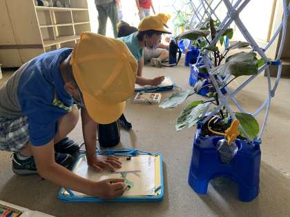 生活科で育てている野菜のお世話と観察をしました。水やりとわき芽やまびきもしました。間引きはオクラを育てている子たちがしました。少しかわいそうな感じもしますが、元気に育てるためには仕方ありません。どの野菜にも、花や実もついてきています。大きく成長してきていることがよくわかりますね。