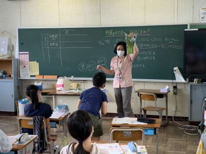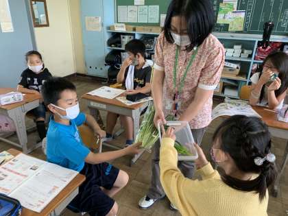 ゆでると野菜はどう変化するのか調べました。ゆでる前(生)とゆでた後の野菜を比べます。服部先生が用意した小松菜とジャガイモを比べてみます。色、かたさ、その他気づいたことを実際に見たりさわったりしてみました。なかなかゆでた後の野菜に直接触れることはありませんので、みんな興味津々でしたね。