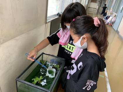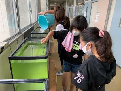 5年生が飼っているメダカ。生き物ですから、お世話をしなければなりません。餌やり、水替え、そしてたまごからかえった赤ちゃんのお世話。5年生のみなさんが、頑張ってお世話をしています。赤ちゃん用の水そうに引っ越しのお世話をする子。そして、水かえのために重いバケツを持ち上げて水槽に水を入れている子。お世話もしっかり頑張っています。