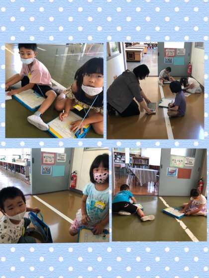 自分たちの力で,決められた場所まで行き,扉に貼ってある色画用紙の色をワークシートに塗ります。2人ペアで協力して,ワークシートの色を塗ることができました!