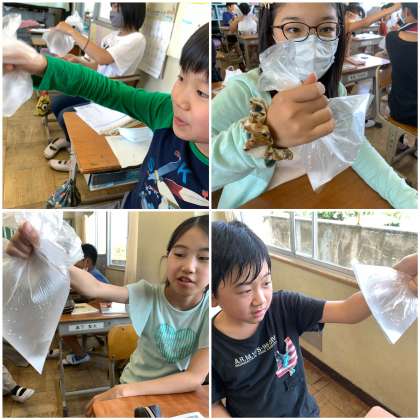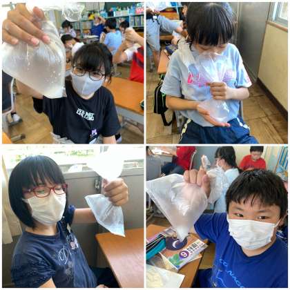 石灰水が二酸化炭素に触れると白くなる性質を使って、自分の呼気が石灰水によって白くなるか調べました。ビニール袋に入れた石灰水は、見事に白く濁りましたね。