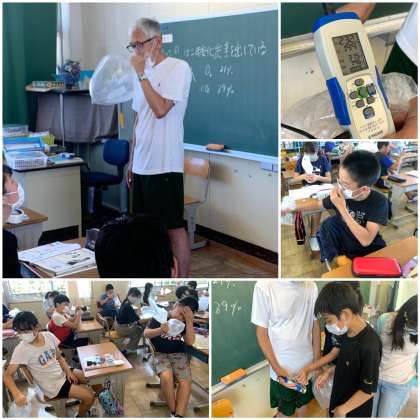 気体検知器を使った計測は、森川先生の呼気を使って調べてみました。体の中から出た空気は、酸素が減り、二酸化炭素が増えていることがわかりましたね。