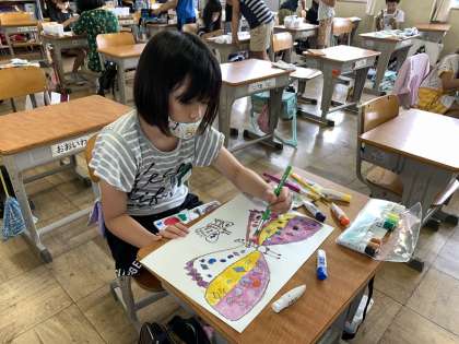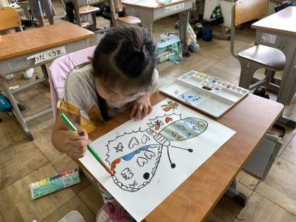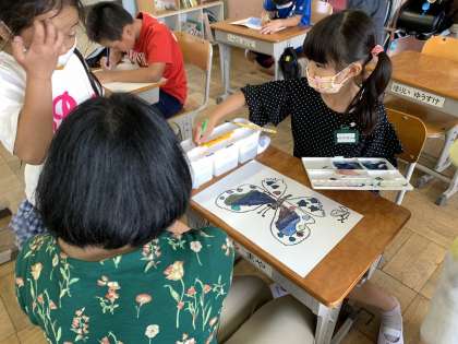 水彩絵の具を使って、チョウチョの絵を描いています。きれいなチョウチョがいっぱいですね!もうまもなく完成します。