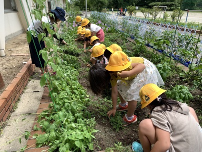 学年花壇の草取りに励む1年生です。学年花壇のあさがおもずいぶん伸びましたね。みんなの背よりも長くなりましたよ。1年生のおかげで、花壇もきれいになりました!