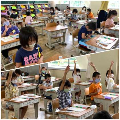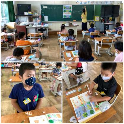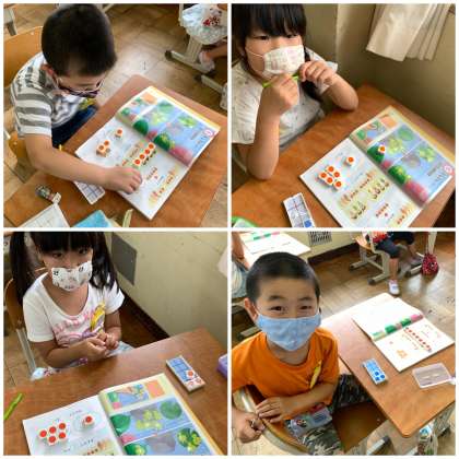 いよいよたしざんの学習です。数図ブロックを使って合わせていくつになるかを考えます。両手を使って、数図ブロックを合わせるところがポイントです。