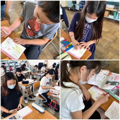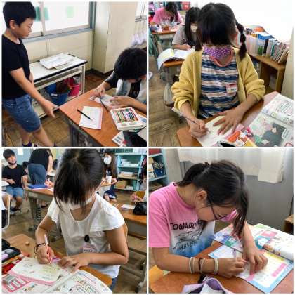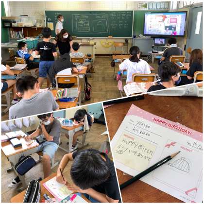 ペアで誕生日や欲しいものを英語でたずね合って、カードに書く学習です。友達に送るカードをみんな頑張って書いています。ゲームや服、PCやスマホ、欲しいものがいっぱいだね。友達へのメッセージには、優しい気持ちがあふれています。