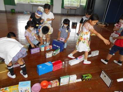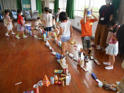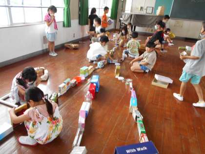 図工の時間にみんながお家から持ってきた空き箱や空き缶を使っていろいろなものを作りました。最初はグループに分かれて作っていましたが,作っていくうちにみんなで迷路を作ることになりました。クラスのみんなで協力をして迷路を作ることができてよかったですね。しかけを考えたり,分かれ道を作ったり、とても面白い迷路でした。