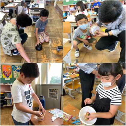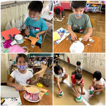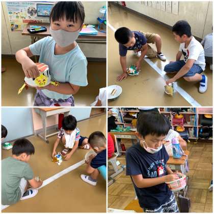 生活科のおもちゃ作り、今日は「とことこかめ」を作りました。インスタントラーメンなどの容器に乾電池を輪ゴムで取り付けます。容器は、かめだけではなく、いろいろな動物に変身しています。教室や廊下で、みんなでおもちゃを動かして楽しく遊びました!