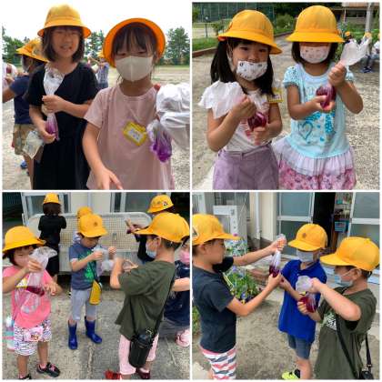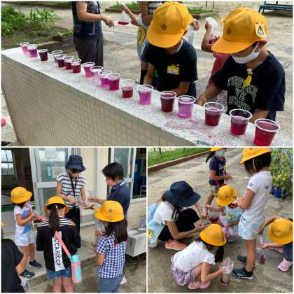 あさがおの花を使って色水遊びをしました。同じ赤でもいろいろな赤や、中にはずいぶん青色に近いような色水もあります。きれいな色にみんな喜んで色水作りをしています。