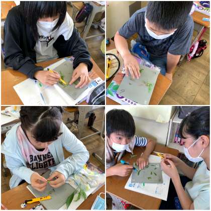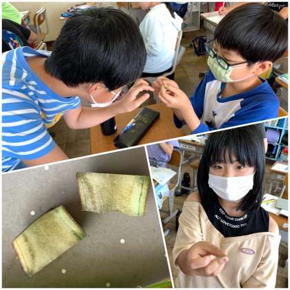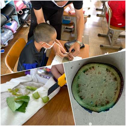 ホウセンカの根を青インクに浸して、ホウセンカの体を染め、根・茎・葉を切って、どのように染まっているかを観察しました。