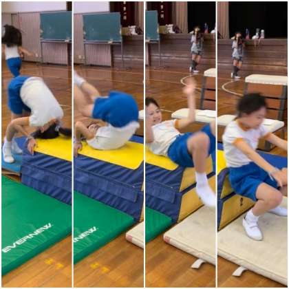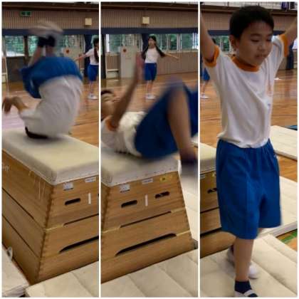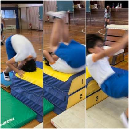 跳び箱の台上前転の練習をしました。マットの上であれば簡単にできる前転も、跳び箱の上となると少し恐怖心が生まれます。低い跳び箱から順に練習をすれば、恐怖心は克服できます。みんなじょうずにできるようになっています。