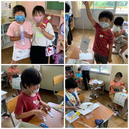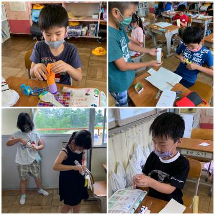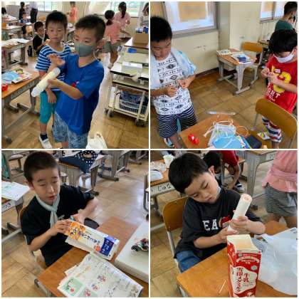 作り方を確認して、みんな制作に熱中しています。うまくできたかな?みんなで楽しく遊ぼうね。