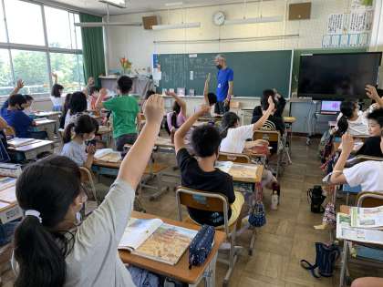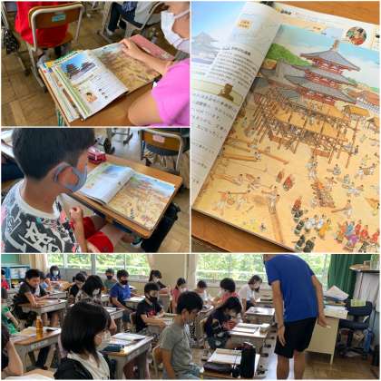 教科書に掲載されている法隆寺五重塔の建設の様子の絵を見て、気づいたことや不思議だと思ったことをどんどん発表しています。